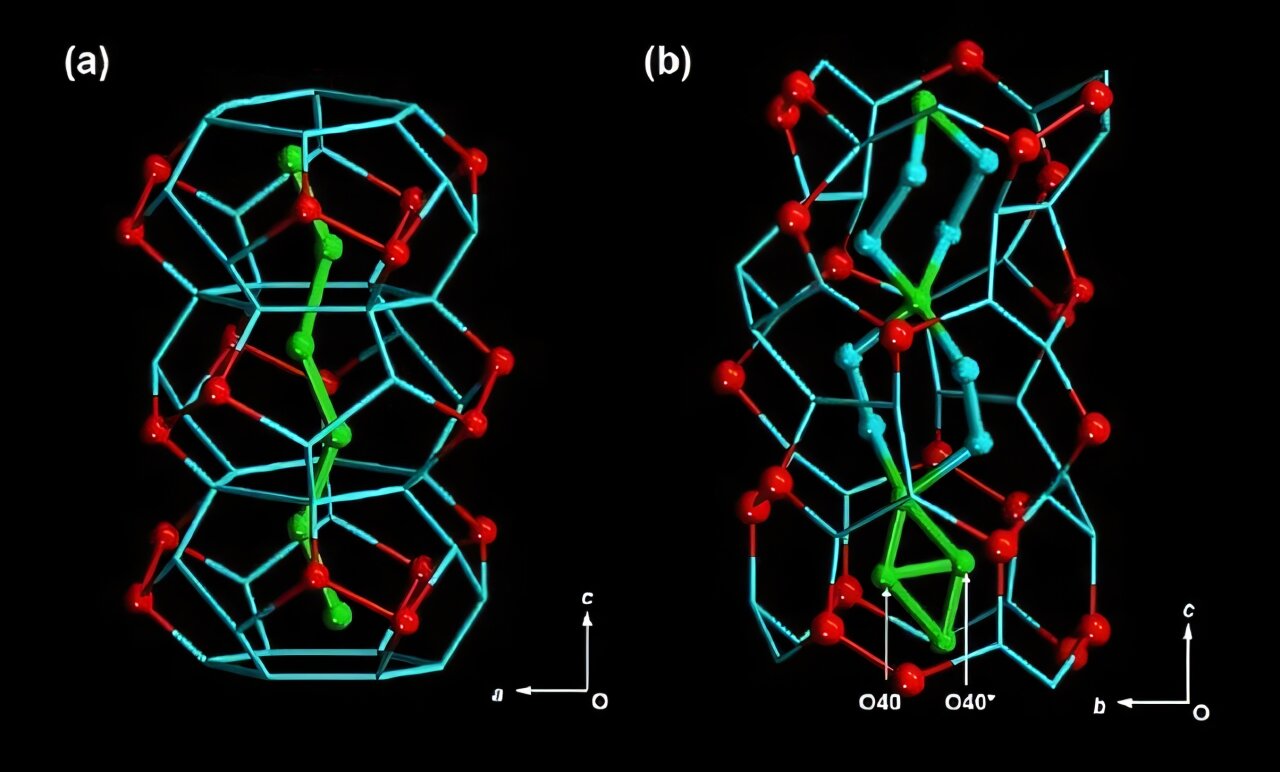 The left image shows a crystal structure of dynamic water molecule cluster like liquid at −20 °C in the supercooled water state revealed previously by X-ray structural analysis. The right image shows the crystal structure of water/ice molecule clusters at –90 ˚C in the premelting state. Red spheres indicate water regularly hydrogen-bonded to the oxygen atoms on the pore wall surface. Credit: Professor Makoto Tadokoro / Tokyo University of Science, Japan. DOI: 10.1021/jacs.5c04573