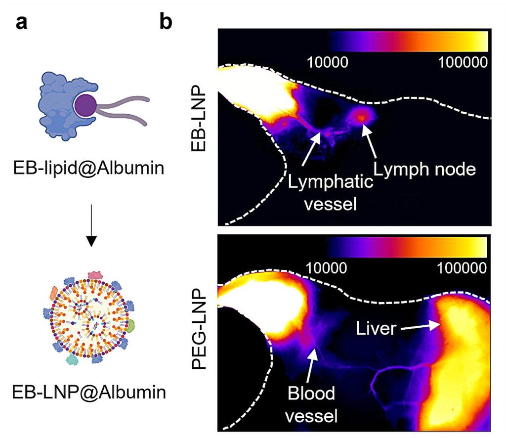 The team synthesized a special Evans Blue-modified lipid (EB-lipid) that binds tightly to albumin. When injected intramuscularly, EB-LNPs recruit albumin to their surface, which naturally guides them to lymph nodes instead of the liver.