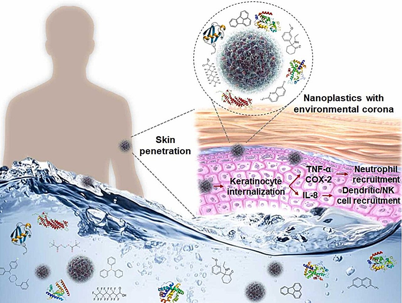 Chemicals enter hitching Nanoplastics ride skin