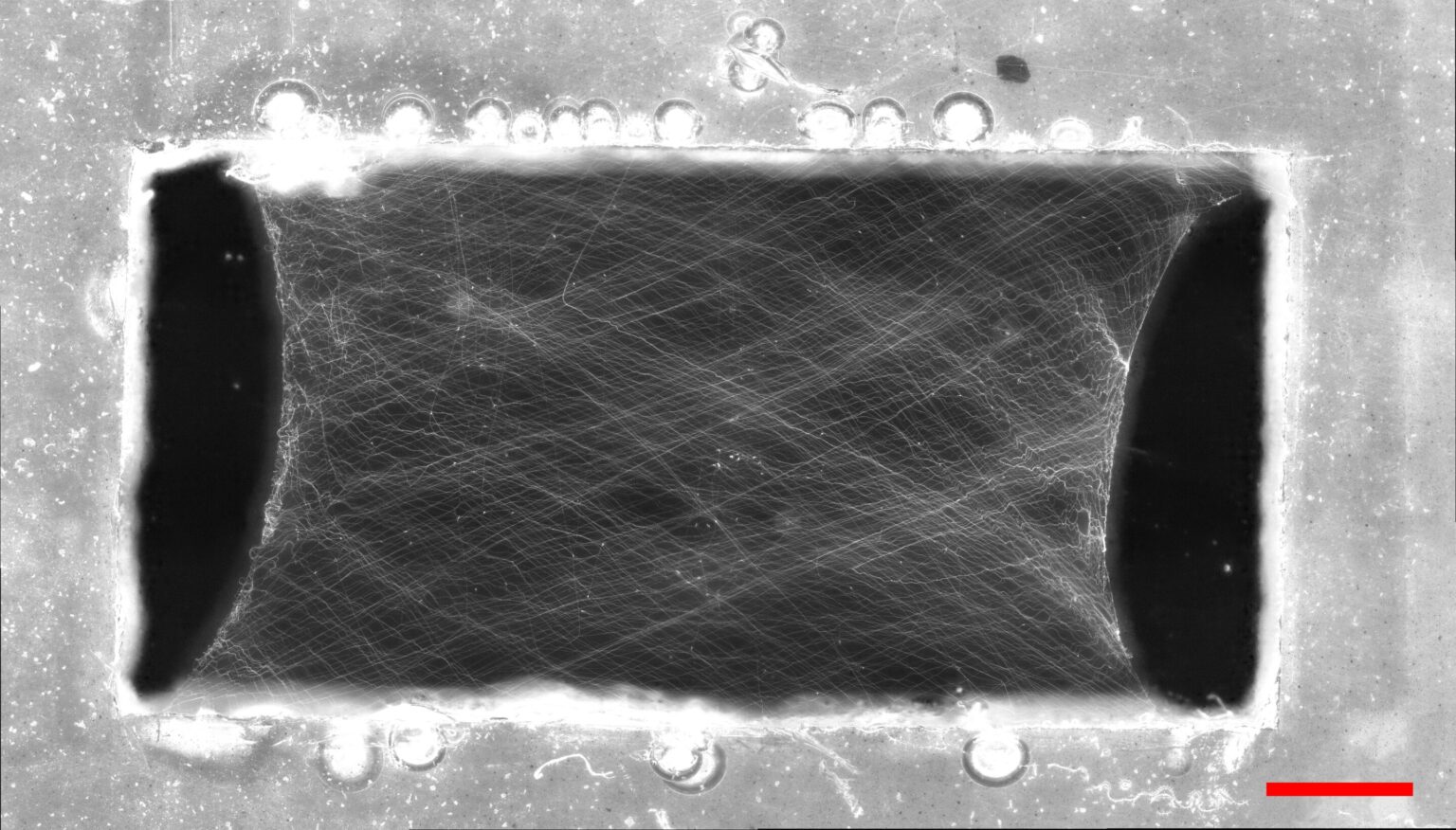 Printed polyethylene oxide nanofiber network with 5000 fibers. Scale bar is 1 mm. Credit: University of Illinois at Urbana-Champaign