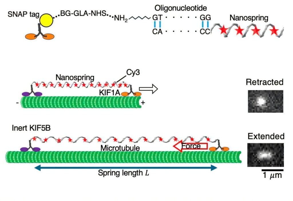 Researchers from the University of Tokyo and the National Institute of Information and Communications Technology (NICT) in Japan have now measured changes in the force of KIF1A using a nanospring, a tiny, coiled structure made of DNA, which could lead to improved diagnosis of diseases related to the protein’s mutations.