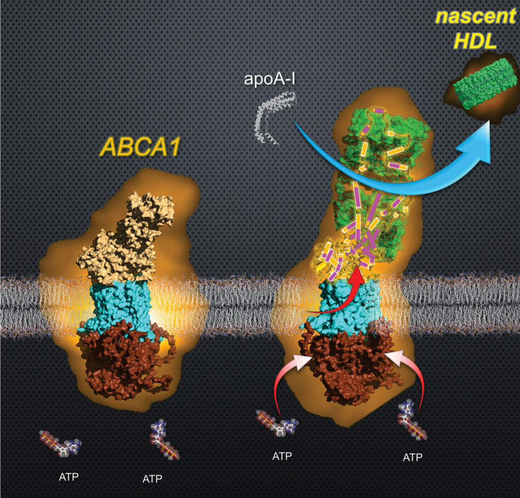 They saw that HDL generation is a much more complex process, in which ABCA1 transfers lipids into the ECD through the process of ATP hydrolysis, which releases the chemical energy stored in the bonds of ATP. The ECD temporarily grows a new structure to store a vast amount of lipids, which are then loaded en-masse onto apolipoprotein A-I (apoA-I). During this process, the ECD experiences a sudden and dynamic restructuring, losing about 30% of its volume. The loading of the lipids onto apoA-I produces the nascent HDLs.