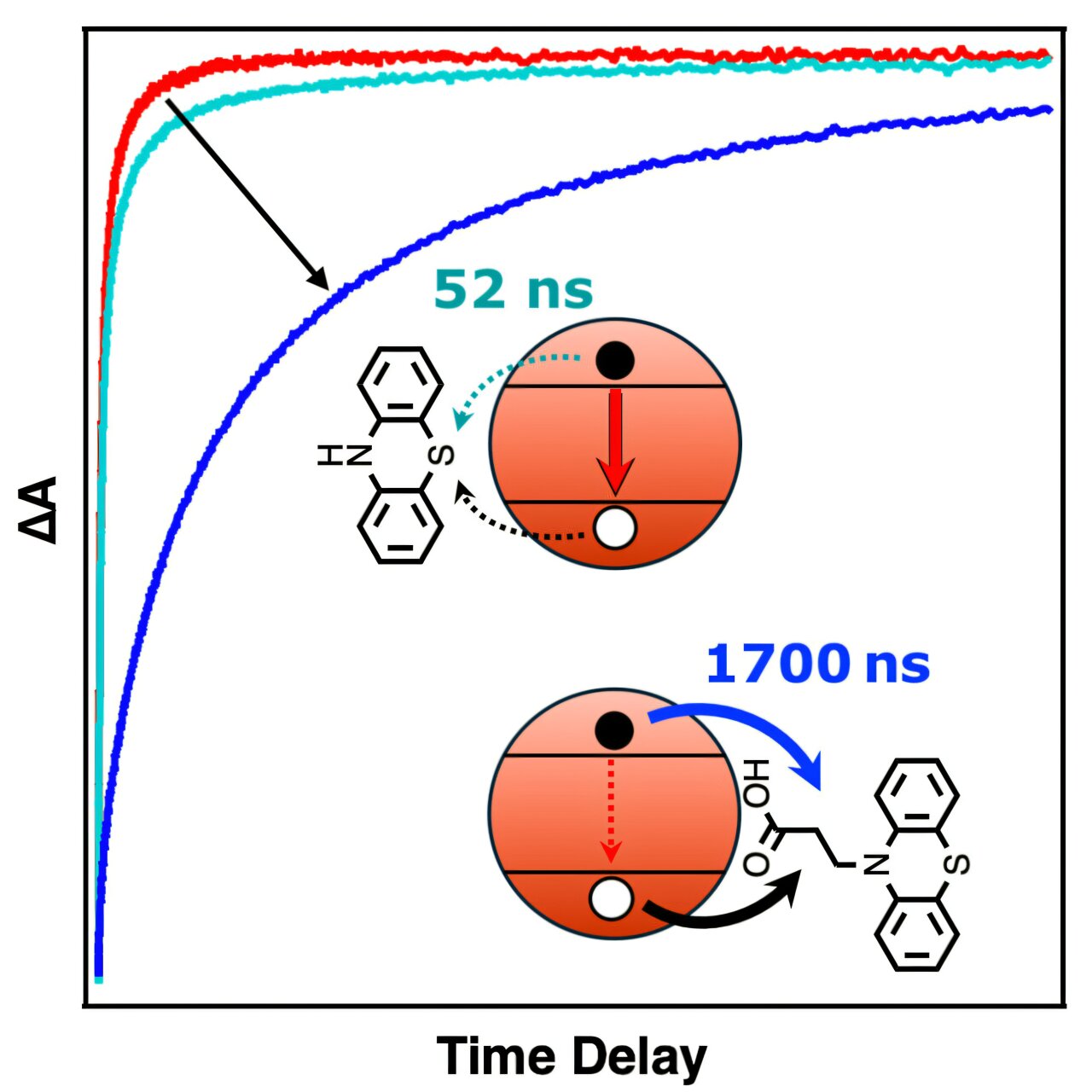 To solve this problem, the team focused on building what we might call a molecular dam, something that helps prevent—or at least slow down—the electron and the hole from recombining. This research started with cadmium sulfide (CdS) nanocrystals and designed a molecule (in this case a phenothiazine derivative) with two key features; first, the incorporation of a chemical group that acts as a sticky anchor (in this case a carboxylate group), which binds strongly to the nanocrystal surface; and second, a molecular structure that quickly accepts the positive charge (the hole), from the nanocrystal to realize the light-driven charge separation event.