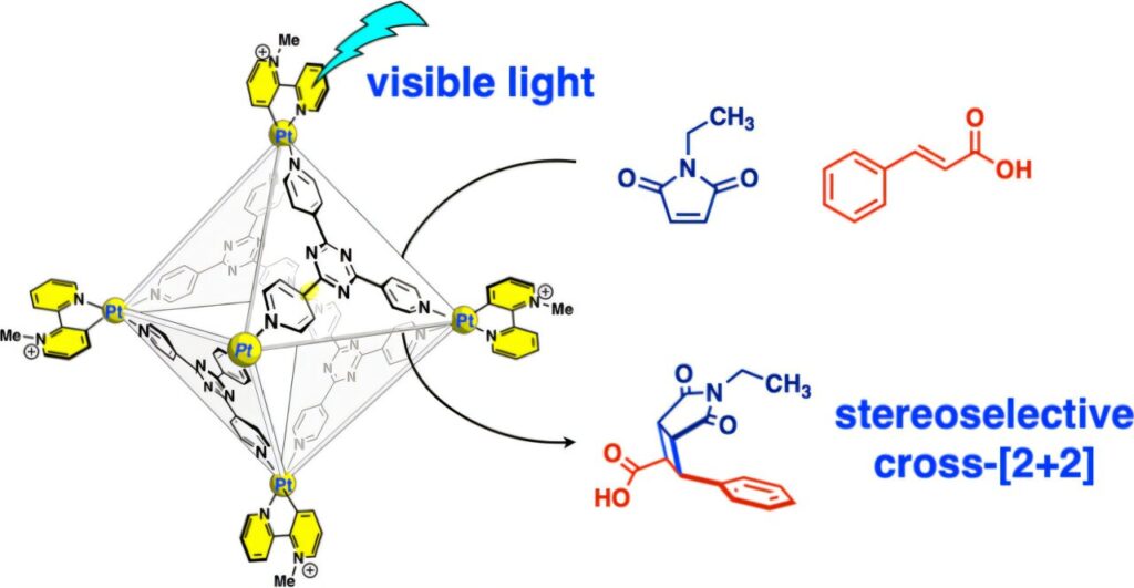 Researchers have engineered a novel M6L4 octahedral molecular cage by integrating photoactive cyclometalated platinum(II) units, creating a visible-light-responsive “nanoreactor” that drives highly efficient photochemical reactions through precise molecular confinement. This innovative design overcomes the limitations of previous hosts, achieving perfect stereo- and site-selective cross-[2 + 2] cycloaddition reactions, and most notably, enabling catalytic cross-[2 + 2] cycloaddition of chemically inert substrates using this supramolecular confinement approach.