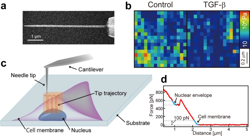 The new NE-AFM method developed by Takehiko Ichikawa and colleagues at Kanazawa University overcomes these barriers by inserting a nanoneedle probe directly into living cells thousands of times without causing severe damage, allowing nanoscale mapping of nuclear elasticity.