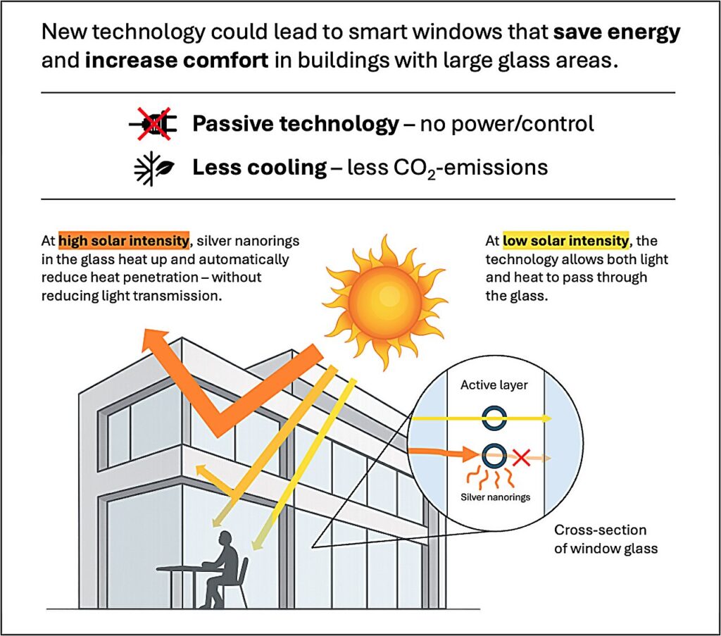 A new Danish research breakthrough could make buildings far more energy-efficient in the future. Researchers from Aarhus University’s Interdisciplinary Nanoscience Center (iNANO) have developed a light-responsive hybrid material based on so-called silver nanorings that automatically responds to solar intensity and regulates how much heat penetrates through windows.