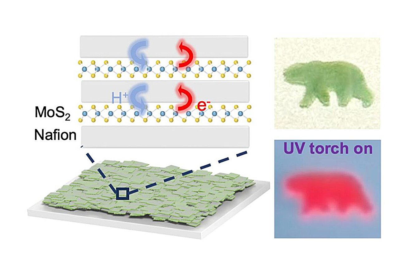 The team used a semiconductor called molybdenum disulfide, in the form of a so-called “two-dimensional material” only three atoms thick, and Nafion, a polymer used in fuel cells.